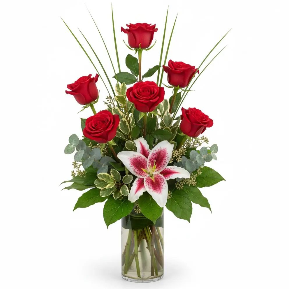 Celebrate life's precious moments with the captivating Ruby Radiance. Six vibrant red roses perfectly complement a graceful lily, surrounded by lush greenery. This stunning arrangement radiates warmth and joy, making it an unforgettable gift.